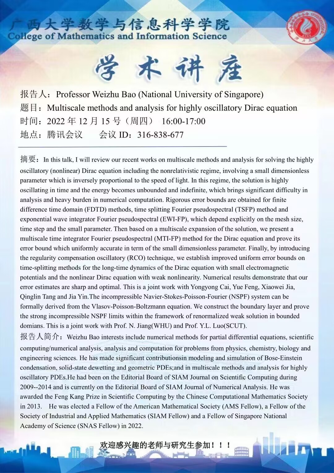 学术讲座: Multiscale methods and analysis for highly oscillatory Dirac equation