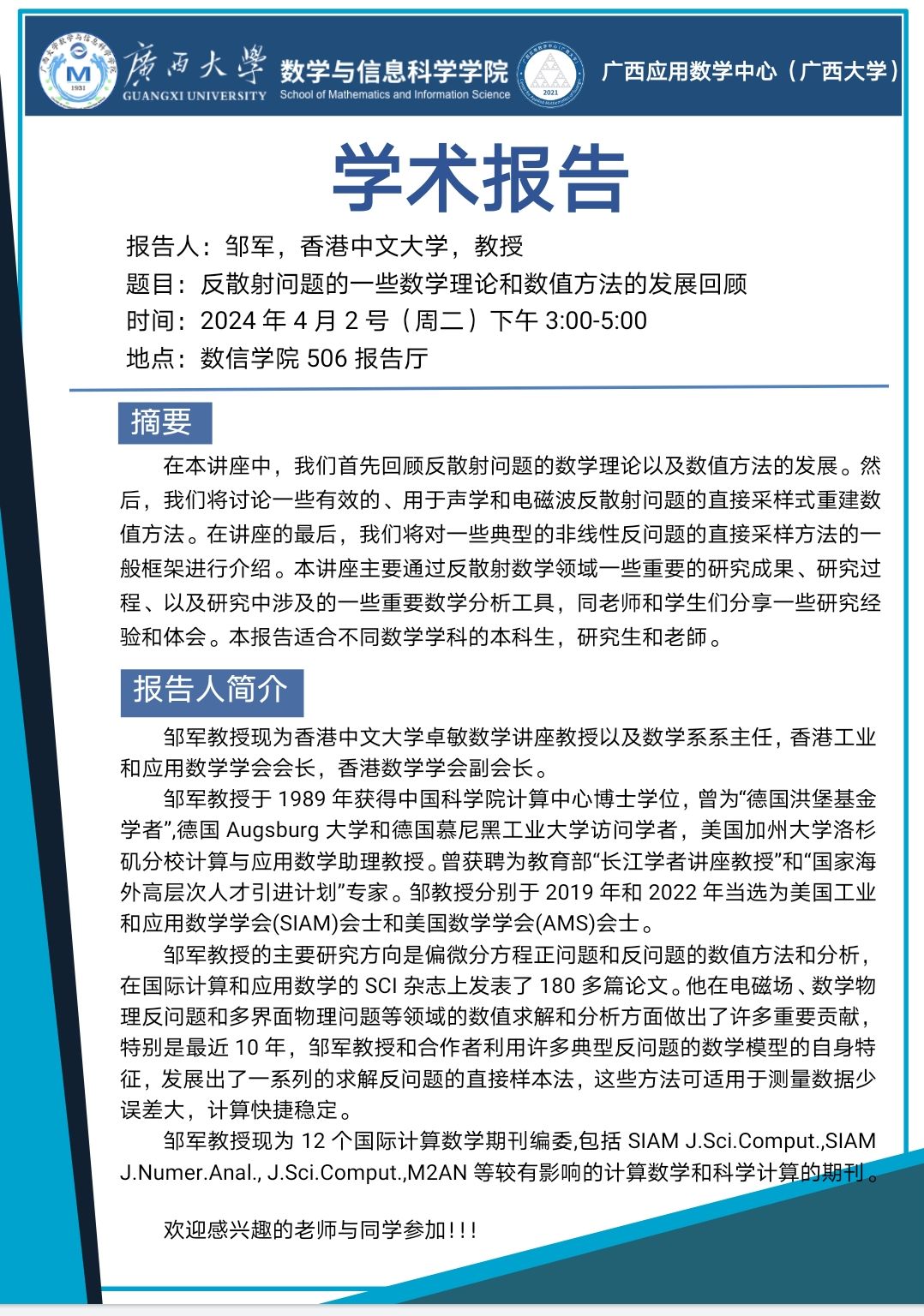 学术报告:反散射问题的一些数学理论和数值方法的发展回顾