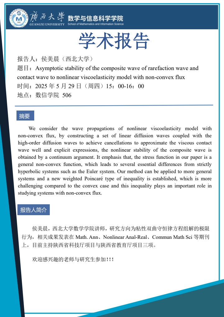 学术报告:Asymptotic stability of the composite wave of rarefaction wave and contact wave to nonlinear viscoelasticity model with non-convex flux