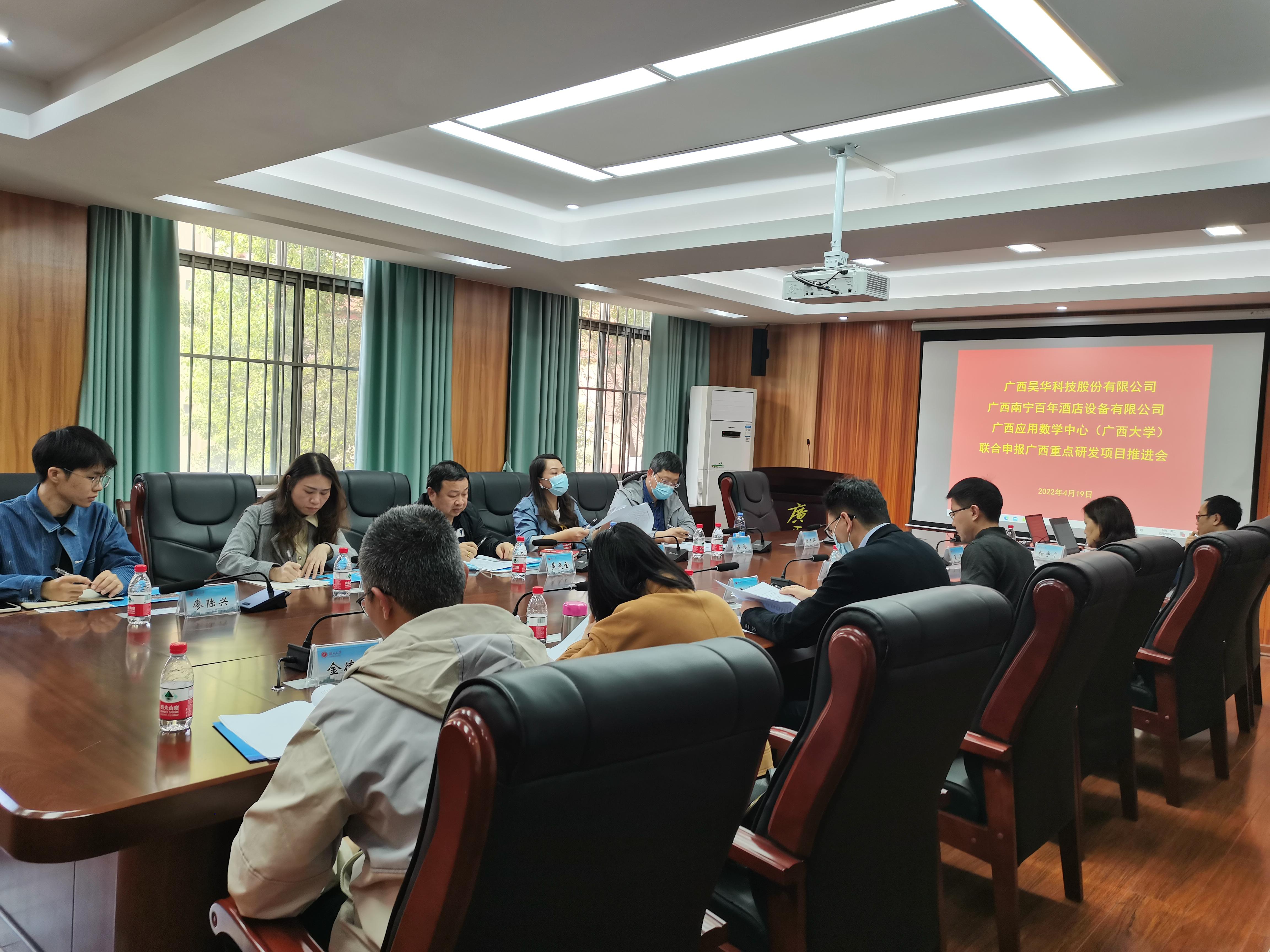 召开联合申报广西重点研发项目推进会。广西南宁百年酒店设备有限公司总经理黄连金、副总经理侯洁,广西优耐信息技术有限公司项目申报部经理梁晶,广西应用数学中心(h动画