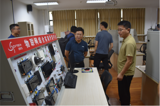 广西科技师范学院数学与计算机科学学院院长周优军首先对中心团队到访表示了热烈欢迎,同时介绍了数计学院师资、生源、就业、互联网+、产业落地等情况;袁功林副主任首先感谢数计学院的接待,对数计学院每年在互联网+大赛中取得优异成绩表示祝贺。然后介绍中心成立目标就是要立足广西、服务广西政府企业,同广西业界一起共同推进广西产业升级发展情况。在周院长一行的带领下,中心团队一同参观了物联网实验室、实训室等学生实践教学基地。