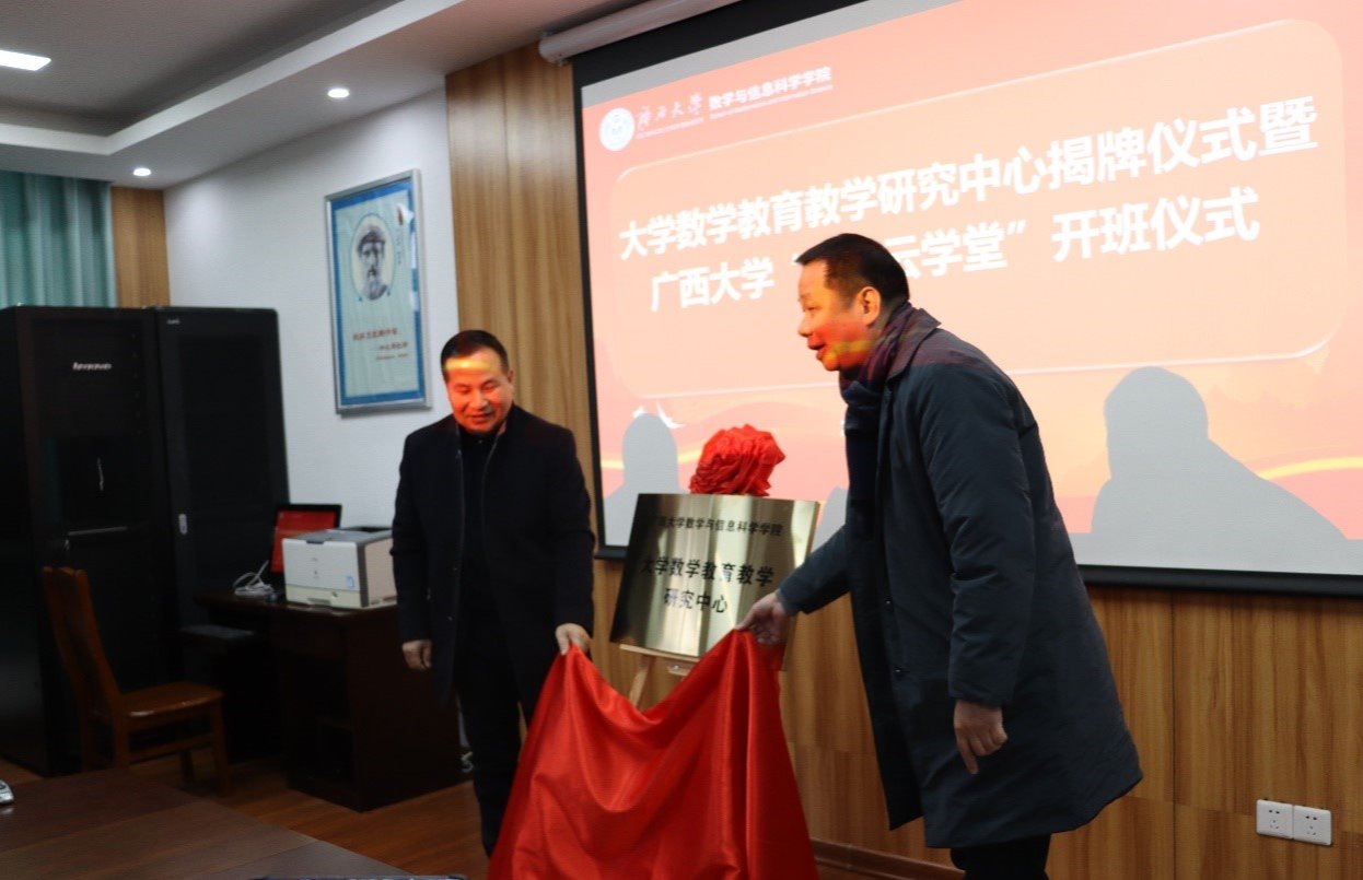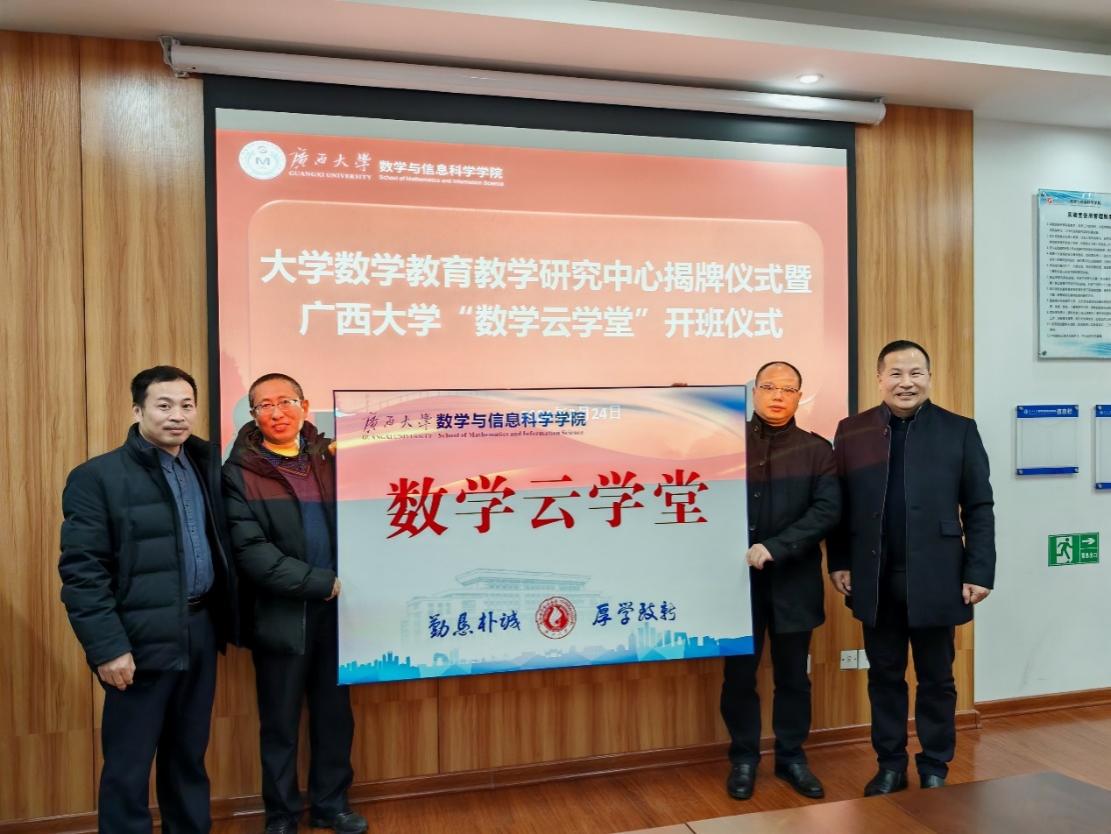 “数学云学堂”开班仪式在学院506会议室举行。学院党委书记覃宪儒、院长郭真华为大学数学教育教学研究中心揭牌,郭真华和特邀专家华中农业大学陈华锋老师为h动画