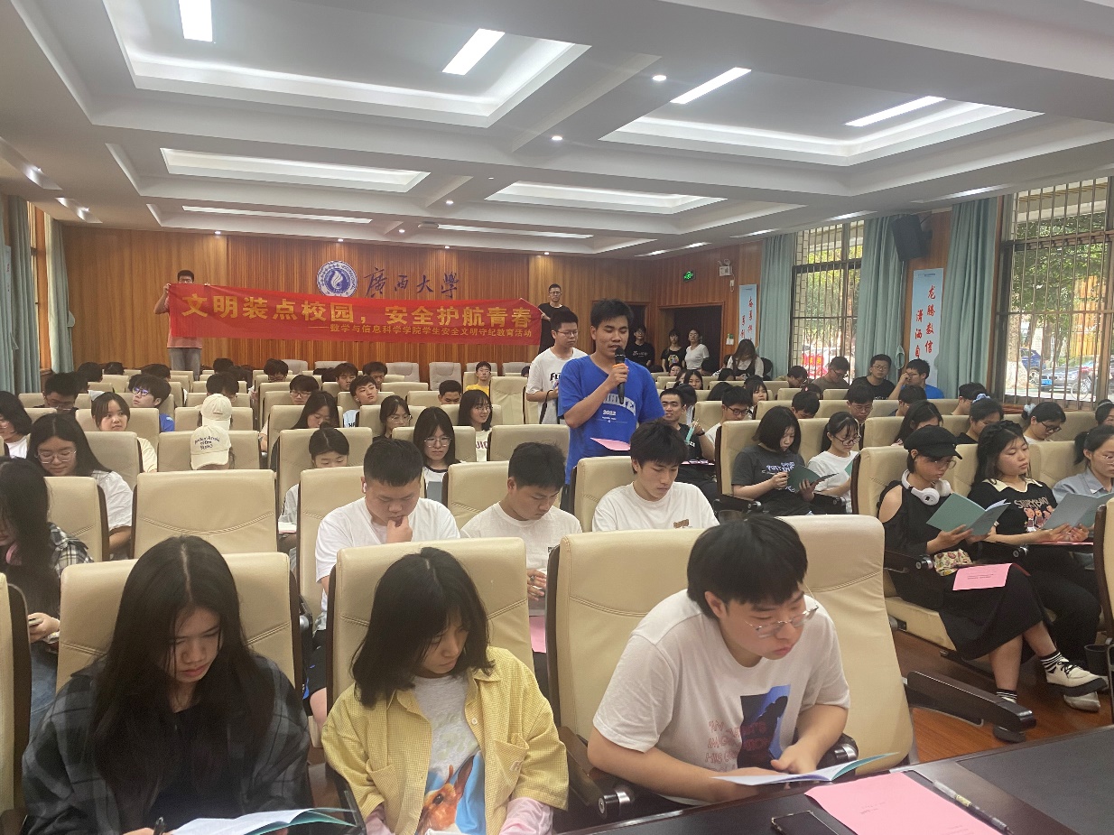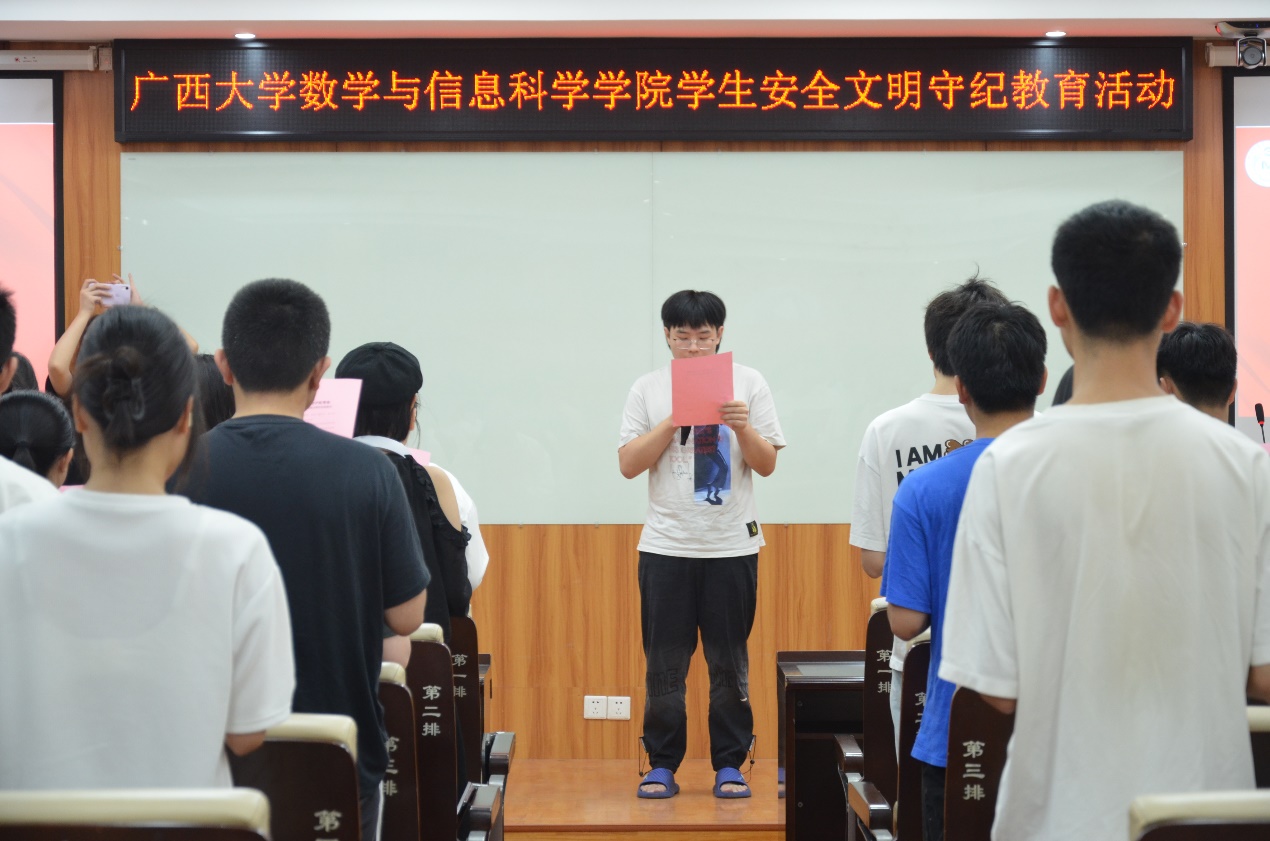 活动中同学们踊跃发言,分享了学习安全文明教育的感受,纷纷表示将会自觉、自律,严守安全底线、提升安全意识,争当文明先锋。最后全体同学一起诵读承诺书,并在承诺书上郑重签字。
