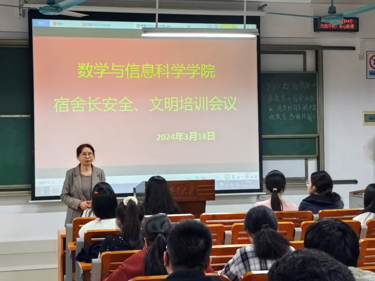 召开学生骨干安全文明守纪专题培训会议。辅导员孙晓黎、刘春霞、周蕾等老师分别从个人卫生、时间管理、宿舍长角色定位、学生骨干作用发挥、心理健康教育等方面进行了具体的工作布置,提醒同学们筑牢同学们时时安全、事事安全、处处安全的堤坝,号召学生骨干勇担职责使命,发挥榜样引领,弘扬道德风尚,倡导文明新风。